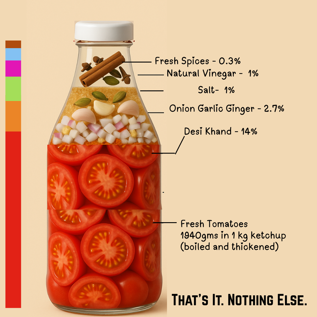 1940gm Tomatoes in 1 kg Ketchup, Desi Khand 14%, Onion 2.2%, Salt 1.1%, Vinegar 1%, Ginger 0.3%, 0.3% of (Cumin, Cinnamon, Cloves, Black Peppercorn, Cardamom), Garlic 0.2%, Sweet potato 0.01%